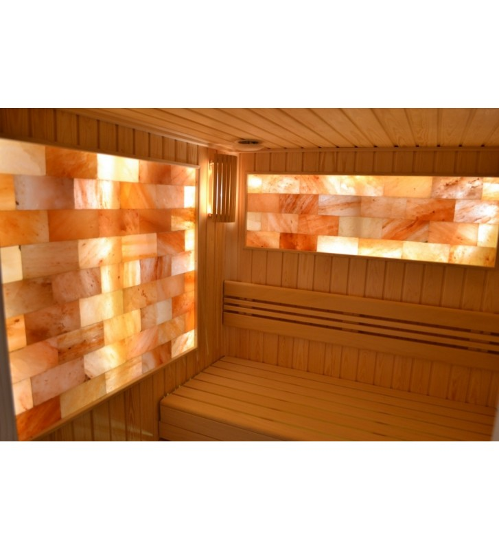Cegły solne doskonale sprawdzają się jako materiał do budowy podświetlanych ścian w kabinach saunowych. Tego rodzaju rozwiązanie nadaje wnętrzu niepowtarzalny charakter i ciepły, przytulny klimat, sprzyjający relaksowi i regeneracji.
