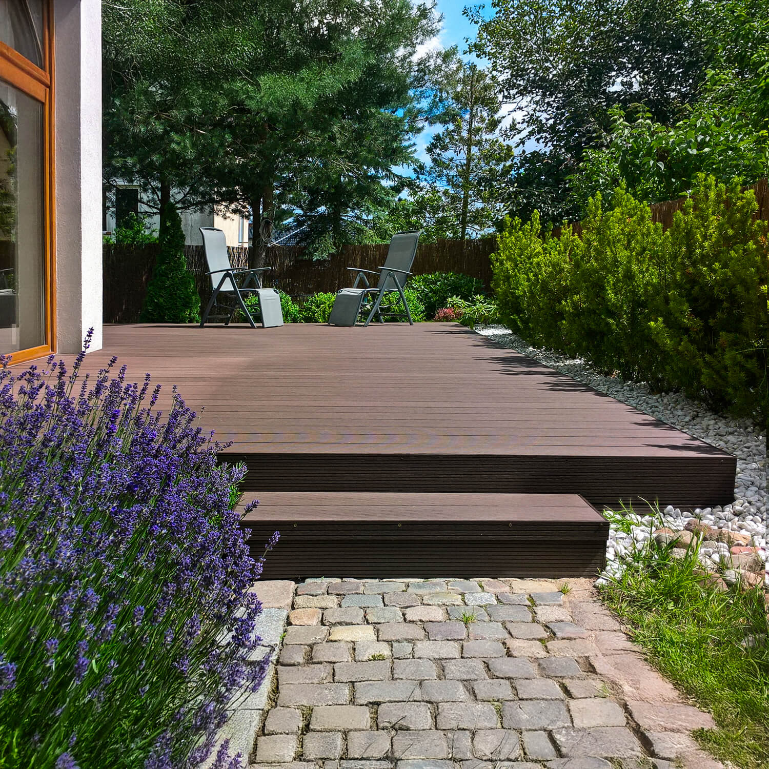 Minimalne wymagania konserwacyjne sprawiają, że taras z desek Standard w kolorze brązowym zachowa piękny wygląd przez długi czas.