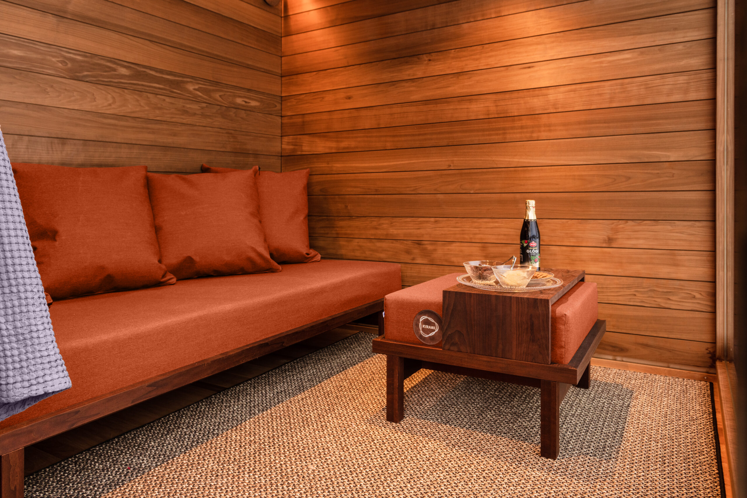 Materiał sofy nadaje się również do użytku na zewnątrz dzięki swojej wodoodporności, ochronie przed promieniowaniem UV i pleśnią. Materiał sofy jest zabezpieczony odpychającym brud teflonem, zapewniając doskonałą ochronę, gdy wychodzisz z sauny, aby się osuszyć. Poduszka siedziska sofy służy jako miejsce do spania, a cztery duże i miękkie poduszki oparcia zachęcają do oparcia się na nich. Aby uzyskać pełny relaks, dobrym pomysłem jest od czasu do czasu położyć stopy na pufie lub alternatywnie użyć pufy jako stołu, razem z tacką dołączoną do pufy. Solidna tacka pozostaje na miejscu na pufie, nawet z Twoimi smakołykami na niej, i można ją w razie potrzeby usunąć. Miękkie części pufy są pokryte tą samą pomarańczową tkaniną co sofa, a tacka jest wykonana z litego drewna poddanego obróbce cieplnej, podobnie jak rama sofy i pufy. Wszystkie części zestawu pasują do siebie idealnie pod względem stylu i przyciągają wzrok, dzięki czemu salon Kirami FinVision® jest jeszcze wygodniejszy.