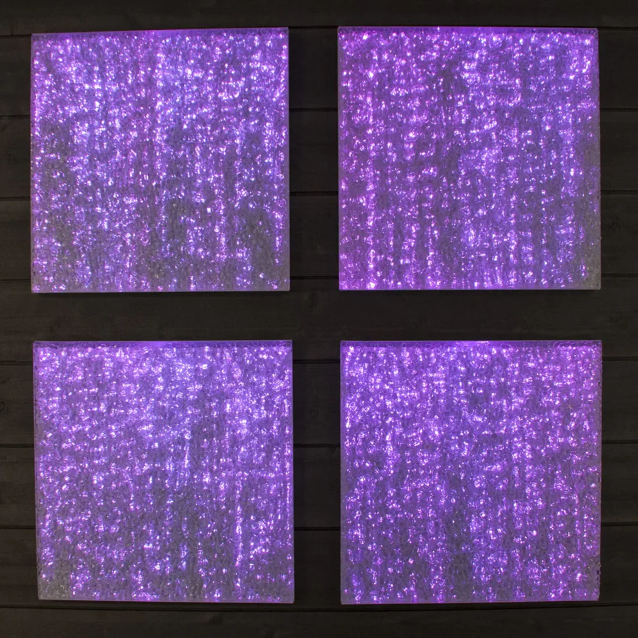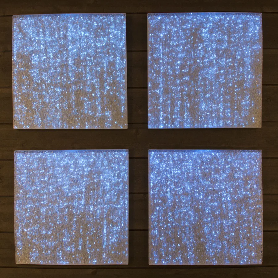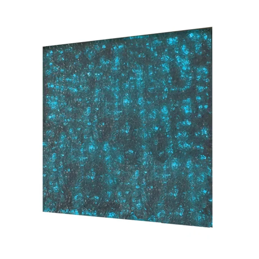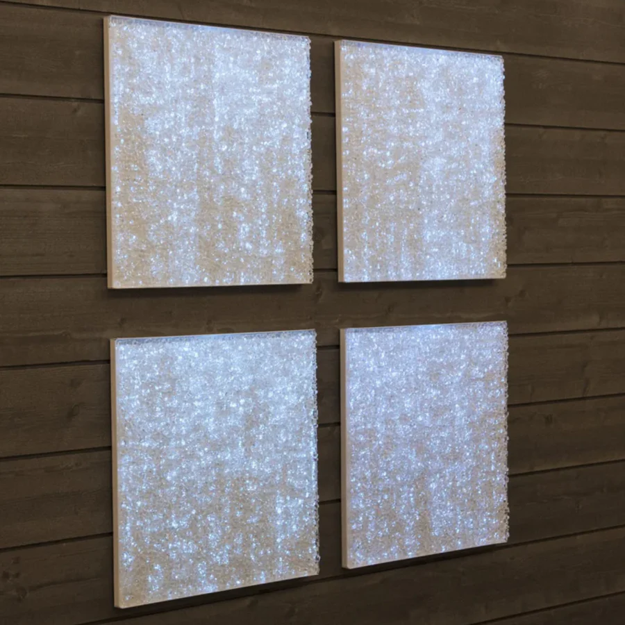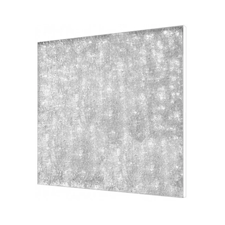 Panel wykonany z kruszonego szkła, które rozprasza światło niczym obraz — przy świetle białym przypomina lód, przy kolorowym — nabiera dekoracyjnej głębi.